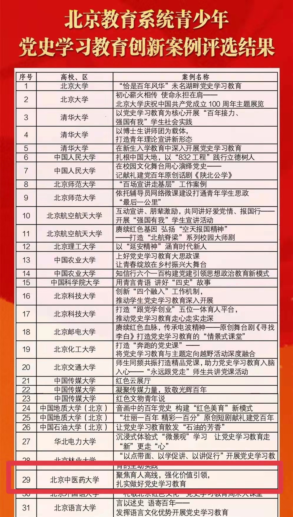 案例系統總結了我校學生系統開展黨史學習教育的特色做法。在黨史學習教育中,學校以主旋律教育為龍頭,開展“永遠跟黨走七個一”系列活動,注重專題學習、豐富校園活動、強化網絡宣傳,推動黨史學習教育入腦入心。以落實實踐活動為抓手,踐行初心使命走深走實,開展“永遠跟黨走 奮進新時代”暑期社會實踐活動,在實踐中重溫黨的故事;完成重大獻禮任務,為中國共產黨百歲華誕獻上青春禮贊;服務國家發展戰略,立足中醫藥特色,全方位服務北京冬奧會和冬殘奧會。以品牌賽事為抓手,舉辦“永遠跟黨走”全國中醫藥高等院校輔導員理論宣講暨第一屆職業能力大賽,為全國中醫藥高等院校輔導員搭建溝通交流平臺,使輔導員隊伍建設見行見效。