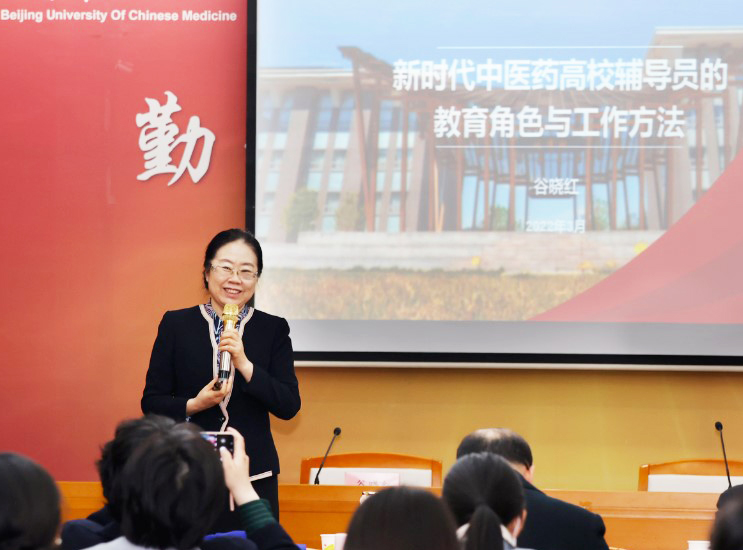 谷曉紅書記以《新時代中醫藥高校輔導員的教育角色與工作方法》為題,分享了自己作為一名資深輔導員和首批輔導員名師的工作經歷與經驗,號召廣大輔導員要做學生“為人、為學、為事、為醫”的典范。谷書記立足中央精神、行業需求和學校的發展戰略,強調我校作為中醫藥高等學校的領頭雁,廣大輔導員要堅持立德樹人根本任務,培養德智體美勞全面發展的新時代青年,實現為黨育人、為國育才的重要使命。谷書記在報告中深刻分析了后疫情時代我校學生現狀與特點,強調輔導員老師要關注學生的身心健康,指導學生建立豁達通透的世界觀、價值觀、人生觀、生命觀;要指導學生學會“道術結合”,傳承精華,守正創新。谷書記通過對輔導員角色、任務與發展的具體分析,強調輔導員應不斷積淀日常工作中的經驗方法,注重提升個人職業素養和能力,結合時代特點上好“抗疫”大思政課、上好“冬奧”大思政課、上好“主旋律”大思政課、上好“中華優秀文化”大思政課。要求廣大輔導員要“不忘初心,牢記使命”,助力學生成才、促進學校發展、實現自我價值。