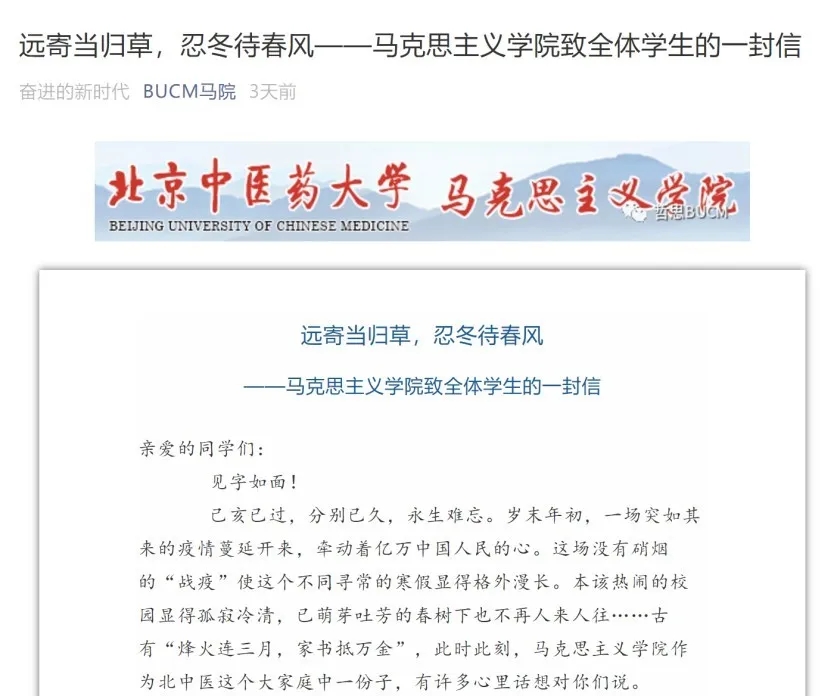疫情防控的“戰場”,是思政課在當下最生動的課堂。馬克思主義學院、北京中醫藥大學思想政治教育研究中心給全校學生寫了一封公開信,“遠寄當歸草,忍冬待春風”,希望廣大同學保持“和煦”的心態,以“借問瘟君欲何往,紙船明燭照天燒”的積極樂觀,不忘初心、牢記學子使命。