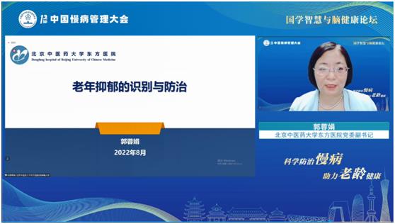 北京中醫藥大學東方醫院黨委副書記、世中聯心身醫學專業委員會會長、中華中醫藥學會心身醫學分會主任委員、北京中醫藥學會心身醫學專業委員會主任委員郭蓉娟教授以《老年抑郁的識別與防治》為主題作了學術報告。郭蓉娟教授從老年抑郁的研究現狀、診斷評估和防治策略方面,介紹了老年抑郁的危害、疾病特點與鑒別、發病機制和治療方法等內容。郭教授指出,老年抑郁、老年癡呆以及腦小血管病之間關系密切,抑郁與腦小血管病之間存在著相互影響,造成惡性循環,最終會加重罹患癡呆的風險,對老年抑郁的正確識別和有效治療是防止癡呆的一個窗口。報告對老年人腦健康的防護具有重要的指導作用和現實意義。