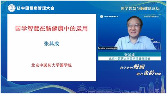 北京中醫藥大學國學院首任院長、著名國學家、中醫文化學家張其成教授以《國學智慧在腦健康中的運用》為主題作學術報告。張其成教授介紹了國學的結構與精髓,從周易洗心、儒家正心、道家清心、佛家明心、醫家調心的多個角度,闡釋了國學修心與腦健康之間的關系。張其成教授的報告打開了一扇國學智慧的窗戶,為從一個新的視角看待腦健康的慢病管理方式提供了啟示。