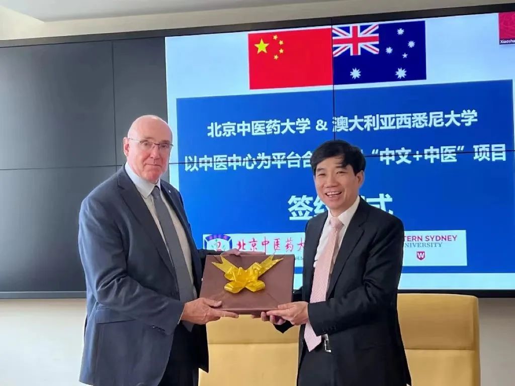 在會談中,雙方就澳大利亞中醫中心的建設進展及未來計劃進行了深入交流。之后,徐安龍校長與西悉尼大學Barney Glover Ao校長分別代表兩校就以中醫中心為平臺合作開展“中文+中醫”項目簽署了合作協議。雙方將借助澳大利亞中醫中心的一體化平臺,在澳開展“中文+中醫”課程及講座、“開放日”活動、“中文+中醫”主題展覽等系列活動,將中文教學融入中醫交流中,推動中醫藥、中文在澳大利亞的傳播。徐安龍校長表示,希望通過此項目的積極開展,將實用的中醫健康知識通過講座及活動傳遞給澳大利亞民眾,擴大中醫中心的“朋友圈”和影響力,推動中文、中醫文化在當地的普及。