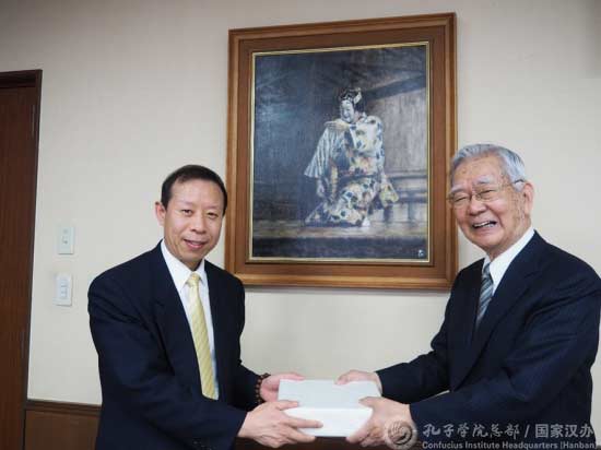 會后,李春生參贊一行還參觀了中醫(yī)藥孔子學(xué)院活動中心、事務(wù)局辦公室等場所,并觀賞了藏書,聆聽了工作人員對生藥、針灸用具等展品的講解。最后,新家荘平理事長向李參贊贈送了一副親手繪制的日本傳統(tǒng)能劇臨摹畫。