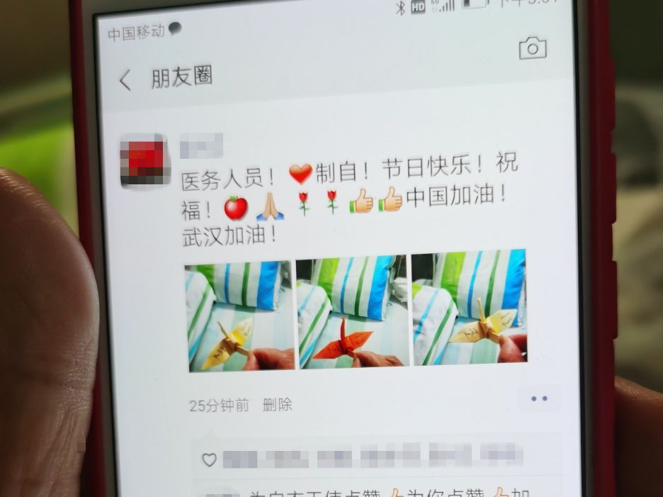 一名患者在出院時(shí),特意把第二臨床醫(yī)學(xué)院(東方醫(yī)院)護(hù)士王曉嘉和王曉君送的小小千紙鶴帶回了家。她說,“不能辜負(fù)了她們的一片心意,感謝東方醫(yī)院每一位醫(yī)生、護(hù)士這么多天的治療和精心照顧!”