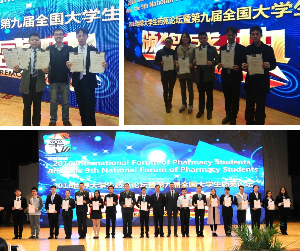 本次論壇設置“藥學科學”和“藥學服務”兩個子論壇,邀請了美、歐、亞、非以及大陸、港澳臺等醫藥學類院校藥學專業學生做論壇交流。設有大學生創新成果獎、優秀論文獎和優秀壁報獎三類獎項。通過壁報交流、論文盲選、分論壇展示等環節,由我校雷海民和王鵬龍指導的,2013級藥學專業郭文博同學的《Design, Synthesis, and Biological Evaluation of the Novel Glycyrrhetinic acid-Cinnamoyl Hybrids as Anti-Tumor Agents》榮獲“創新成果一等獎”、“優秀論文獎”和“優秀壁報獎”。由張冰和林志健指導的,2014級臨床中藥學專業劉鵬同學的《二秦顆粒抗炎、鎮痛、解熱的藥理作用研究》榮獲“創新成果二等獎”和“優秀壁報獎”。