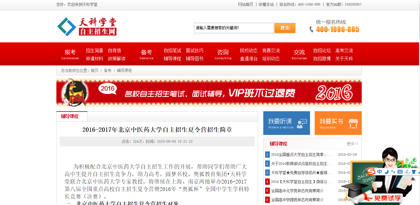 2015年8月8日,一家名為“天科學堂”的網站發布了“2016-2017年北京中醫藥大學自主招生夏令營招生簡章”。近期,隨著夏令營招生季的到來,該條消息得到了較多關注。