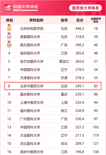 4月18日上午,軟科正式發布了“2024年軟科中國大學排名”。在2024軟科中國醫藥類大學排名中,共84所高校上榜,北京協和醫學院、首都醫科大學和南方醫科大學位列前三,我校位列第8名,連續三年領跑中醫藥院校。