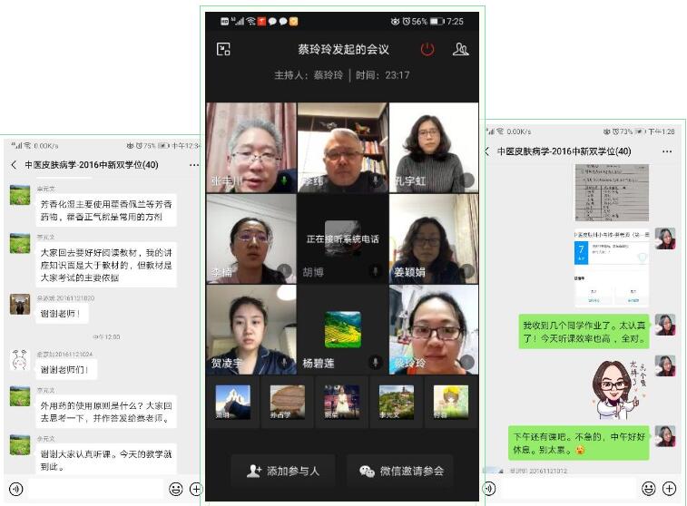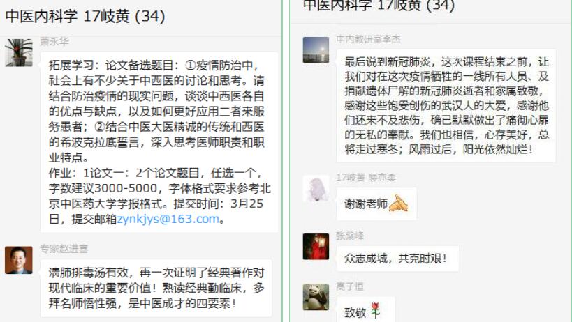 中醫內科學臨床學系的老師們領會學校通知精神,研討線上開課方案,就中醫內科學的教學任務、線上教學資源、教學方法、教材選用、課程考核辦法等方面進行逐一梳理,廣泛收集網絡教學資源,反復研討,數易其稿,并將案例式教學融入其中,注重中醫臨床思維的訓練。采用了學生自學中國大學慕課教學內容和微信群互動答疑的方式,結合疫情講授肺系疾病,指出了經典著作對現代臨床的重要價值,鼓勵同學要提高中醫理論知識水平,堅定為人民健康服務的奉獻精神。