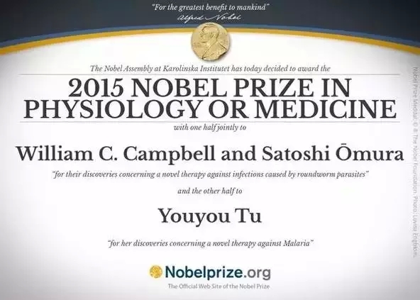 獎項被分為兩部分:一半授予William C. Campbell和大村智為其在治療蛔蟲引起的感染方面作出的貢獻(xiàn);另一半授予屠呦呦,以表彰她對瘧疾治療所做的貢獻(xiàn)。屠呦呦成為首位獲得諾獎科學(xué)類獎項的中國人。