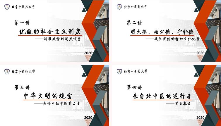 課程共五部分。導論部分為校黨委書記谷曉紅講授的《攜手戰(zhàn)疫,共克時艱》、校長徐安龍講授的《中國抗疫簡史》;第一講《優(yōu)越的社會主義制度》主要講述社會主義制度是我們戰(zhàn)勝疫情的突出制度優(yōu)勢;第二講《明大德、尚公德、守私德》主要講述社會主義核心價值觀、醫(yī)學職業(yè)道德和中醫(yī)醫(yī)德、社會公德和個人私德是我們戰(zhàn)勝疫情的突出精神優(yōu)勢;第三講《中華文明的瑰寶》主要講述中醫(yī)藥是我們的醫(yī)學特色、中西醫(yī)結(jié)合抗疫是我國特有的醫(yī)學優(yōu)勢,切實增強同學們的專業(yè)自信和文化自信;第四講《來自北中醫(yī)的逆行者》以直播連線的方式邀請我校支援武漢一線醫(yī)護人員以及志愿投身抗疫一線的北中醫(yī)學子,現(xiàn)場講述北中醫(yī)人在戰(zhàn)“疫”斗爭中的鮮活經(jīng)歷。