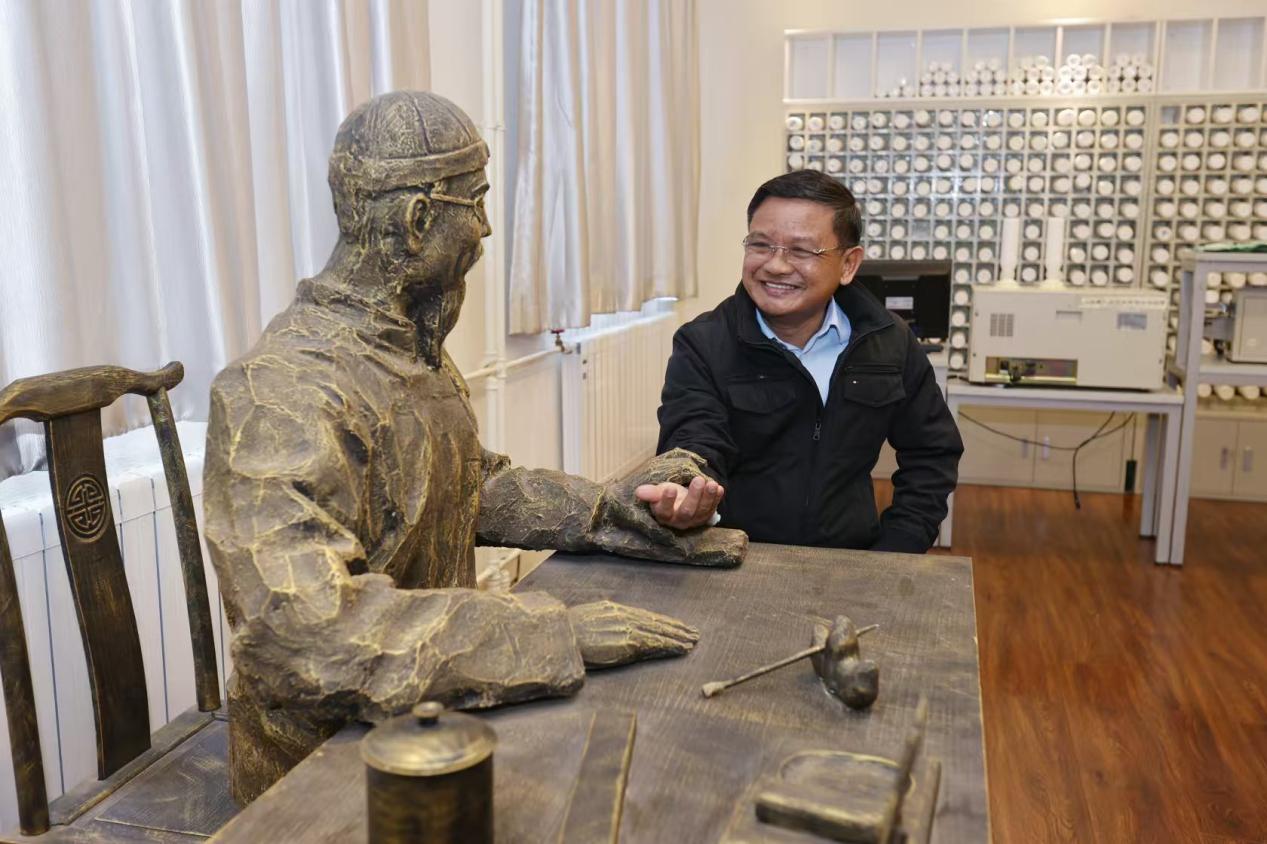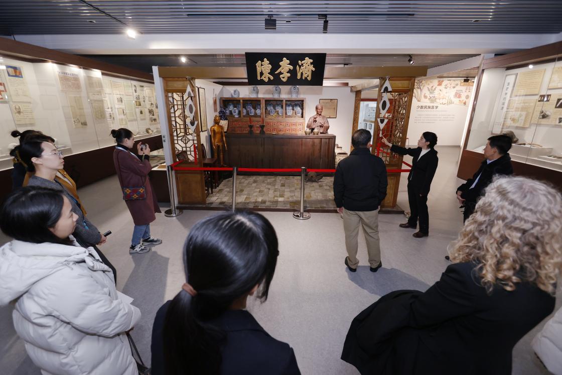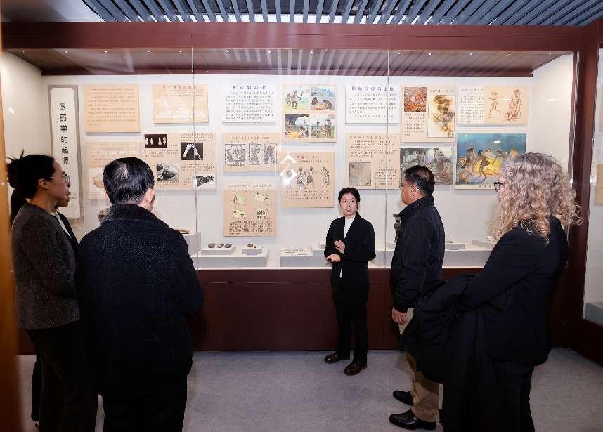 在中醫(yī)藥博物館的中國(guó)醫(yī)學(xué)史展廳,嘉賓在講解員的帶領(lǐng)下領(lǐng)略中醫(yī)藥發(fā)展的源遠(yuǎn)流長(zhǎng),對(duì)龜板上的甲骨文、長(zhǎng)沙馬王堆的導(dǎo)引圖、芳香藥物、孫思邈的坐虎針龍和養(yǎng)生方法、針灸銅人以及清代的圓藥柜、老藥鋪等都表現(xiàn)出極大興趣。