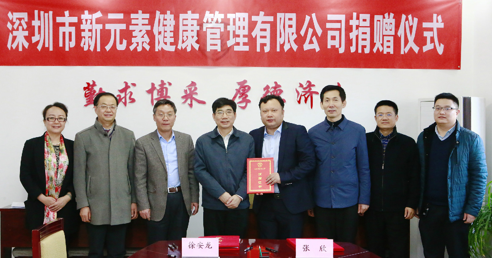 1月11日下午,我校與深圳市新元素健康管理有限公司舉行了捐贈(zèng)儀式并簽訂了公益性捐贈(zèng)協(xié)議。深圳市新元素健康管理有限公司董事長(zhǎng)張欣一行四人出席了捐贈(zèng)儀式,我校校長(zhǎng)徐安龍、副校長(zhǎng)王偉、陶曉華,北京北中資產(chǎn)管理有限公司董事長(zhǎng)張耀圣、校友會(huì)基金會(huì)副秘書(shū)長(zhǎng)閆興麗以及校友會(huì)基金會(huì)工作人員參加了捐贈(zèng)儀式。捐贈(zèng)儀式由陶曉華副校長(zhǎng)主持。