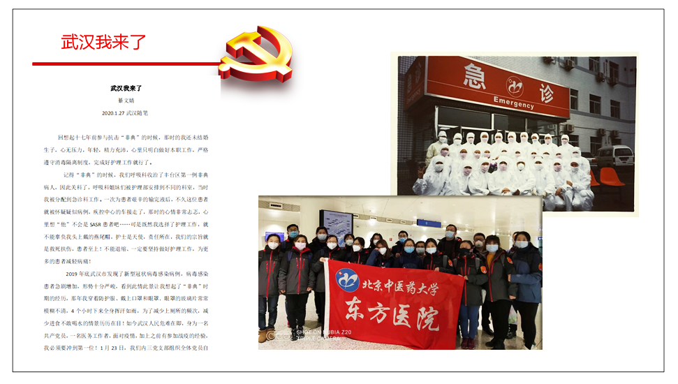 黨支部始終把政治建設(shè)擺在首位,用習(xí)近平新時(shí)代中國特色社會(huì)主義思想武裝黨員頭腦、指導(dǎo)實(shí)踐、推動(dòng)工作。在抗擊新冠疫情戰(zhàn)役中,踐行習(xí)近平總書記“人民至上、生命至上”理念,奮勇?lián)?dāng),深入武漢,赤誠奉獻(xiàn),載譽(yù)而歸;在疫情常態(tài)化防控工作中,創(chuàng)新工作機(jī)制,多措并舉,高質(zhì)量地完成了疫情防控、急診急救、特殊教學(xué)的復(fù)雜任務(wù)。