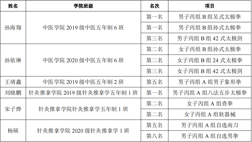 北京中醫(yī)藥大學(xué)武術(shù)隊自成立以來,在國際、國內(nèi)賽場收獲無數(shù)佳績。本次成績的獲得,充分展示了近年來學(xué)校在體育工作以及人才培養(yǎng)領(lǐng)域的工作成果。校體育教學(xué)部將繼續(xù)堅持以人為本,牢固樹立“健康第一”的指導(dǎo)思想,本著“銳意改革、勇于創(chuàng)新、突出特色”的工作思路,努力建設(shè)具有北中醫(yī)特色的體教融合道路。