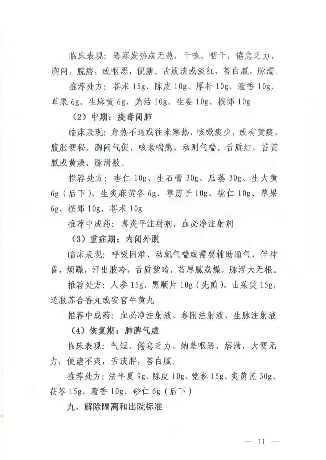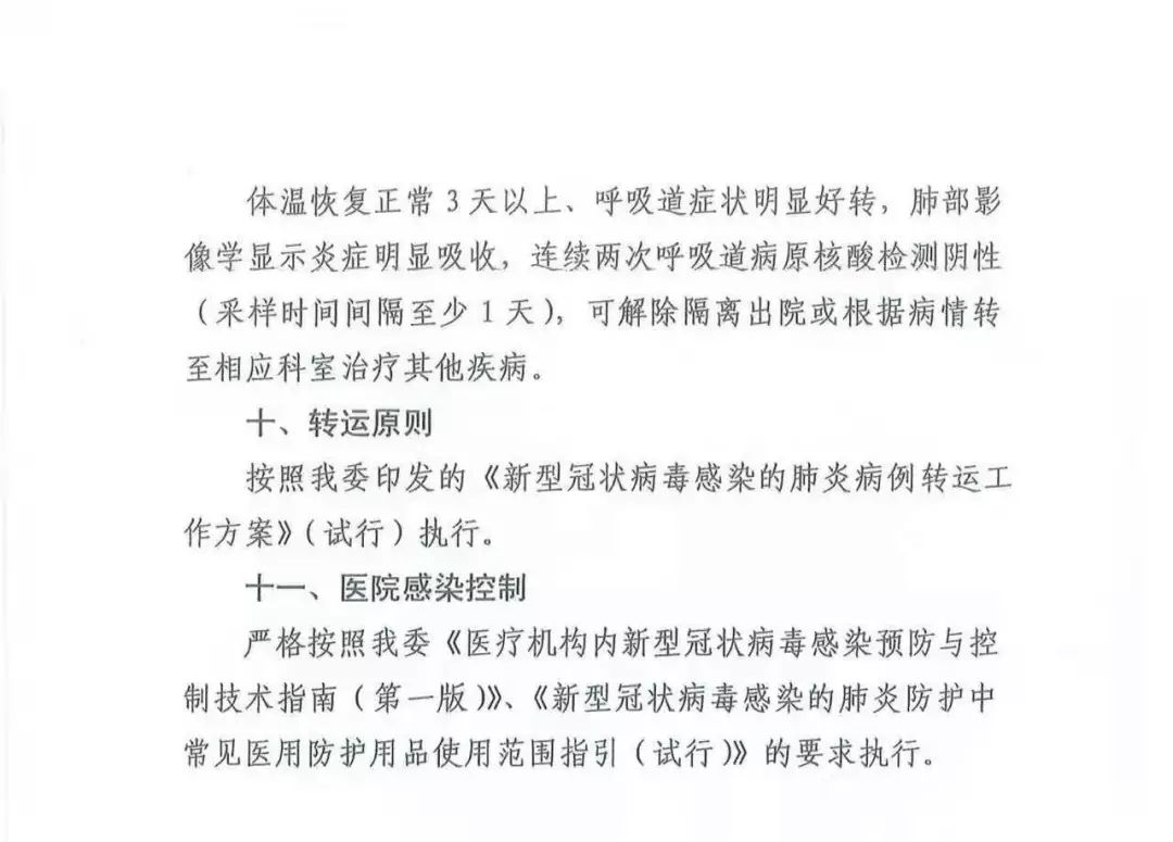 第九,解除隔離和出院標(biāo)準(zhǔn)。在“體溫恢復(fù)正常3天以上、呼吸道癥狀明顯好轉(zhuǎn)”基礎(chǔ)上,增加“肺部影像學(xué)顯示炎癥明顯吸收”,連續(xù)兩次呼吸道病原核酸檢測陰性(采樣時間間隔至少1天),可解除隔離出院或根據(jù)病情轉(zhuǎn)至相應(yīng)科室治療其他疾病。