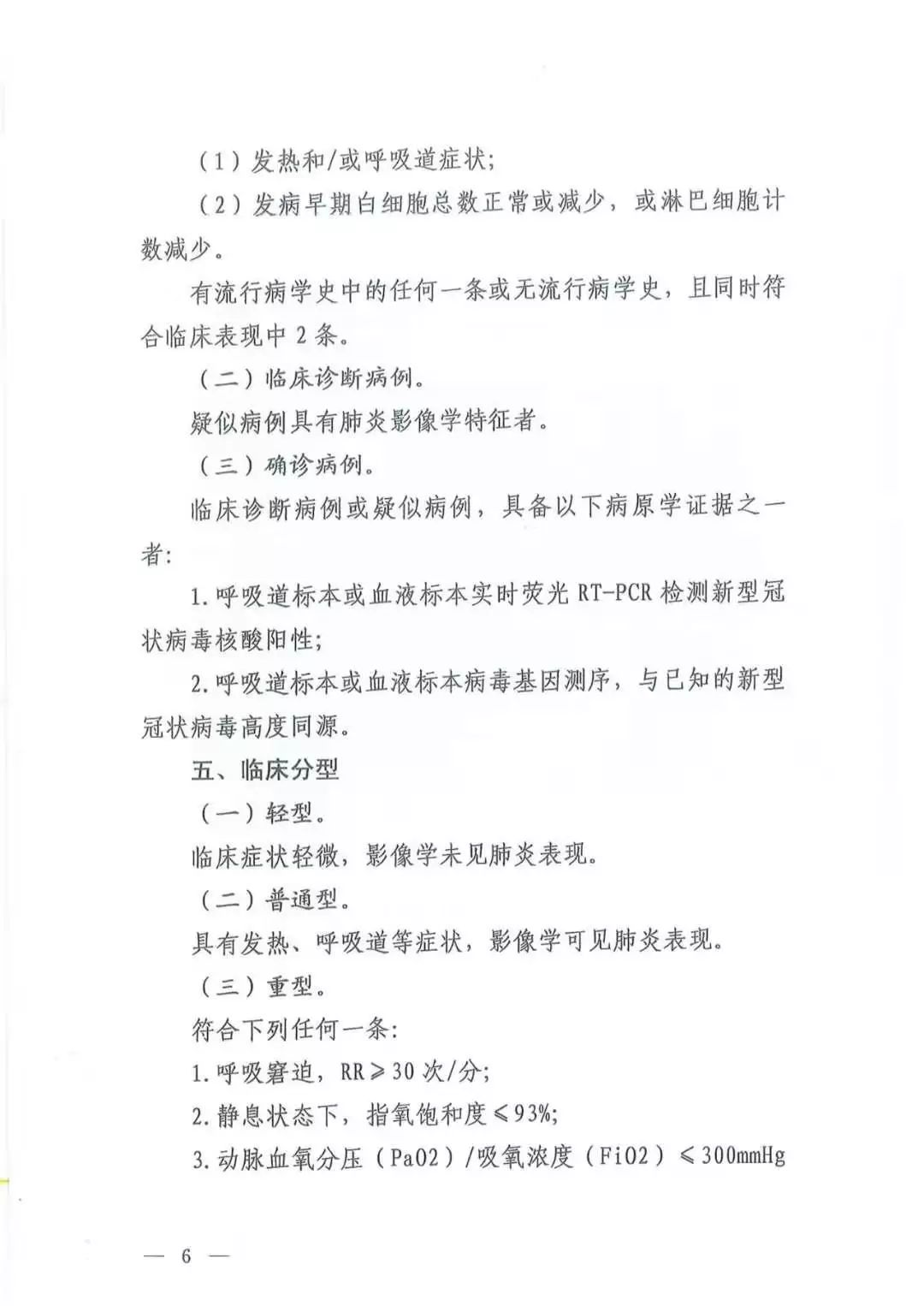 第五,臨床分型。根據(jù)是否有臨床癥狀、是否有肺炎、肺炎的嚴(yán)重程度、是否出現(xiàn)呼吸衰竭、休克、有無其他器官功能衰竭等分為輕型(臨床癥狀輕微,影像學(xué)未見肺炎表現(xiàn));普通型(發(fā)熱、呼吸道等癥狀,影像學(xué)可見肺炎表現(xiàn)的);重型(呼吸窘迫,RR≥30次/分;靜息狀態(tài)下,指氧飽和度≤93%;動脈血氧分壓(PaO2)/吸氧濃度(FiO2)≤300mmHg)和危重型(出現(xiàn)呼吸衰竭,且需要機械通氣;出現(xiàn)休克;合并其他器官功能衰竭需ICU監(jiān)護治療。)