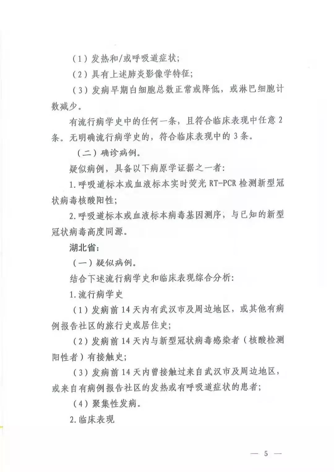 湖北以外其他省份仍然分為“疑似病例”和“確診病例”兩類。基于已經(jīng)發(fā)現(xiàn)沒有明確流行病學(xué)史的確診病例,故將“無明確流行病學(xué)史的,符合臨床表現(xiàn)中的3條(發(fā)熱和/或呼吸道癥狀;具有上述肺炎影像學(xué)特征;發(fā)病早期白細(xì)胞總數(shù)正常或降低,或淋巴細(xì)胞計數(shù)減少。)”也納入疑似病例進行排查。確診病例診斷標(biāo)準(zhǔn)沒變(需有呼吸道標(biāo)本或血液標(biāo)本行實時熒光RT-PCR檢測新型冠狀病毒核酸陽性;或病毒基因測序,與已知的新型冠狀病毒高度同源。)