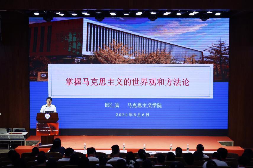 開班儀式結束后,馬克思主義學院院長邱仁富教授以“掌握馬克思主義的世界觀和方法論”為主題作首場報告。邱教授以大家耳熟能詳的故事開頭,以寓教于樂的方式講解馬克思主義中國化的深刻內涵,通過中國特色社會主義紅色脈絡,以習近平新時代中國特色社會主義思想為指導,以“六個必須堅持”為核心,分析百年未有之大變局風波下面臨的挑戰和機遇,勉勵學員學好、用好馬克思主義世界觀和方法論,堅持用黨的創新理論武裝頭腦、指導實踐,為實現中華民族的偉大復興貢獻青春力量。