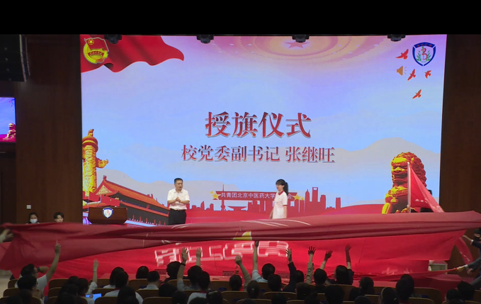 校黨委副書記張繼旺為2024年“青馬工程”培訓班授旗,中醫學院本科生葉鋇鋇作為新學員代表接旗。