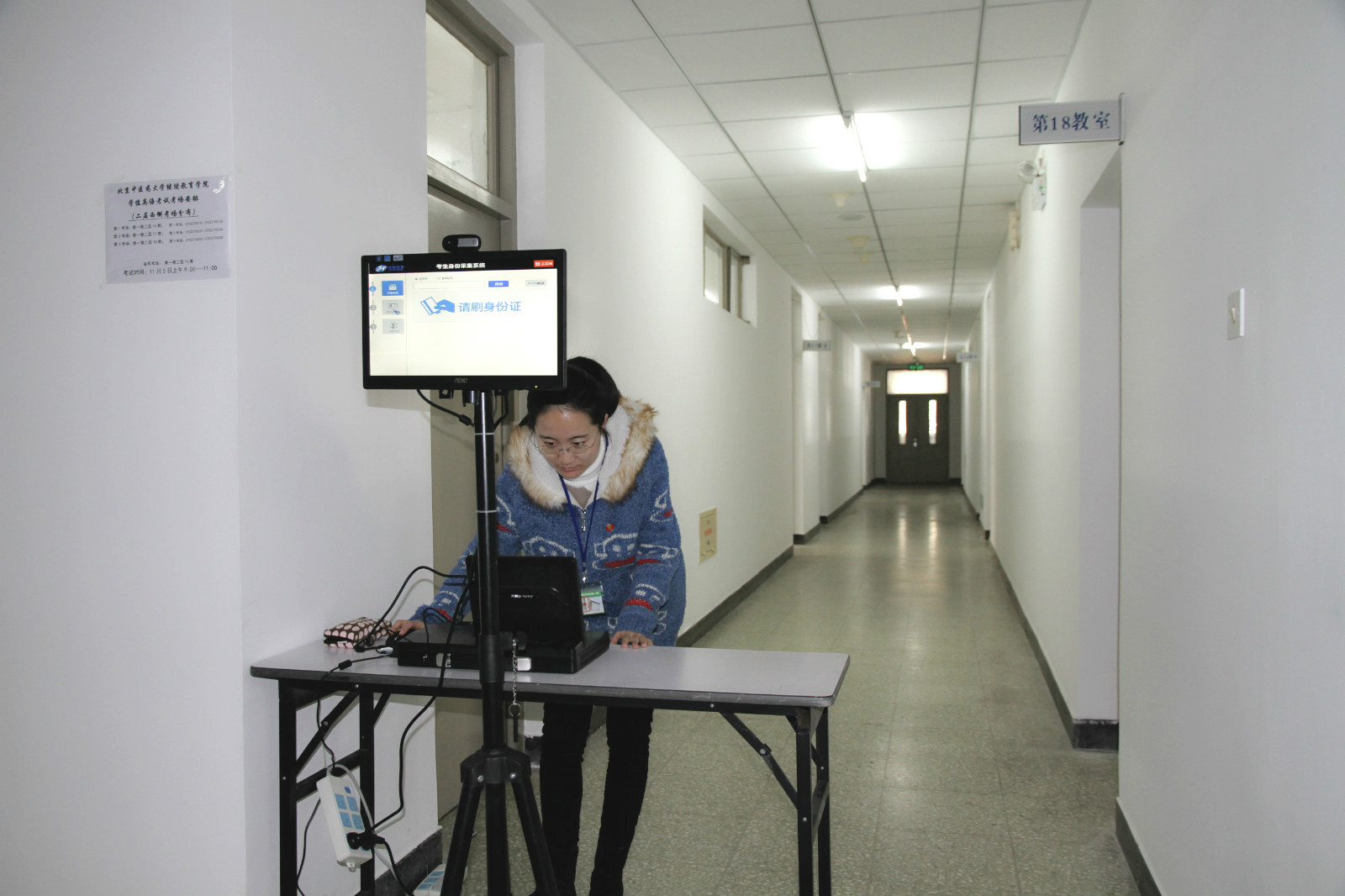 考試當天,繼續(xù)教育學院與保衛(wèi)處工作人員密切配合,考場秩序有條不紊。為嚴肅考風考紀,嚴防考試舞弊, 考場上“人防”和“技防”并舉,在考場進口處,設有“人臉識別”系統核實考生身份,每兩個考場配備使用一臺屏蔽儀,同時啟用電子監(jiān)控設備。