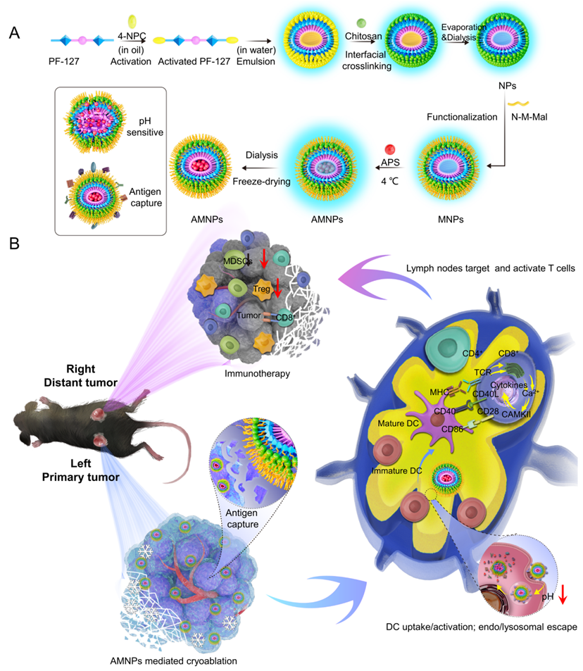 該聯合團隊長期從事冷凍消融治療腫瘤的臨床及基礎研究,曾共同開展了國際首臺冷熱復合治療系統的臨床實驗。在此最新研究中,該團隊總結了數十年冷凍消融臨床研究,為促進和強化冷凍消融的“遠端效應”, 同時結合中藥免疫佐劑特點,以中醫腫瘤臨床最為常用的補氣藥黃芪為切入點,設計了高效抓取冷凍消融碎片的納米腫瘤疫苗,提出了黃芪多糖納米腫瘤疫苗與冷凍消融手術聯合應用的癌癥治療模式,該方法除對局部腫瘤進行有效殺傷外,同時具有激活全身的腫瘤抗原特異性免疫、抑制遠端及轉移瘤體生長的重要作用。