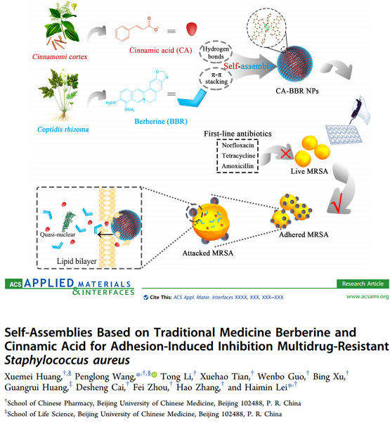 肉桂-黃連藥對相關藥效物質基礎相關研究論文《Self-Assemblies Based on Traditional Medicine Berberine and Cinnamic Acid for Adhesion-induced Inhibition Multidrug-Resistant Staphylococcus aureus 》已在線發表在美國化學會的ACS Applied Materials & Interfaces, 2019, DOI: 10.1021/acsami.9b17722(IF 8.4);