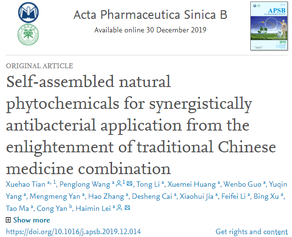 大黃-黃連藥對相關藥效物質基礎相關研究論文《Self-Assembled Natural Phytochemicals for Synergistically Antibacterial Application from the Enlightenment of Traditional Chinese Medicine Combination》已在線發表ELSEVIER的Acta Pharmaceutica Sinica B, 2019, 10.1016/j.apsb.2019.12.014(5.8)。