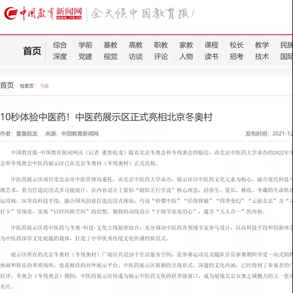 展示區將中醫藥與冬奧-科技-文化主線緊密結合,充分調動學校中醫藥各領域專家參與設計,以高科技手段和創新理念作為中醫藥深厚文化底蘊的載體,打造了中華優秀傳統文化傳播的新范式。這種借助現代科技展現中醫藥魅力的獨特形式,被新華社、光明日報、中國教育報、中國中醫藥報、健康報等多家媒體和國家中醫藥管理局、北京市中醫管理局官微相繼報道。