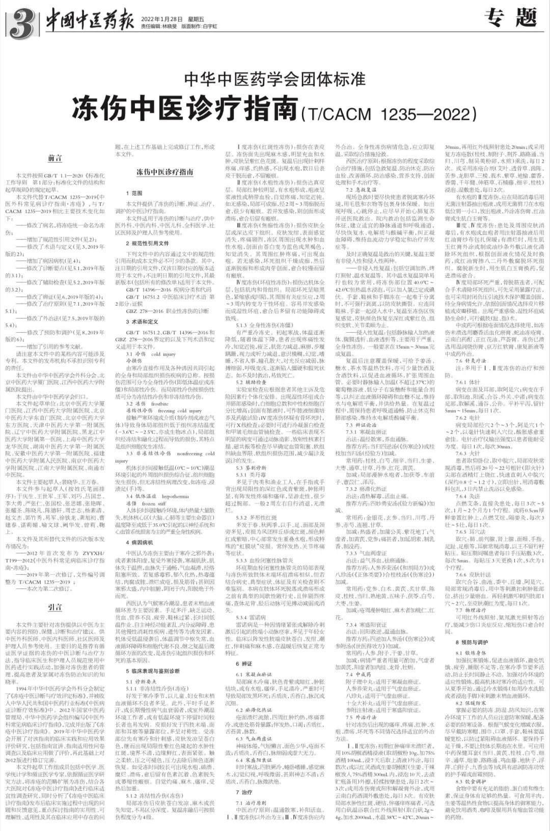 日前,中華中醫藥學會團體標準《凍傷中醫診療指南》(T/CACM1235-2022)發布,該《指南》旨在推薦有循證醫學證據的凍傷中醫診斷與治療方法,指導臨床醫生和護理人員規范使用中醫藥進行臨床實踐,加強對凍傷患者的管理。