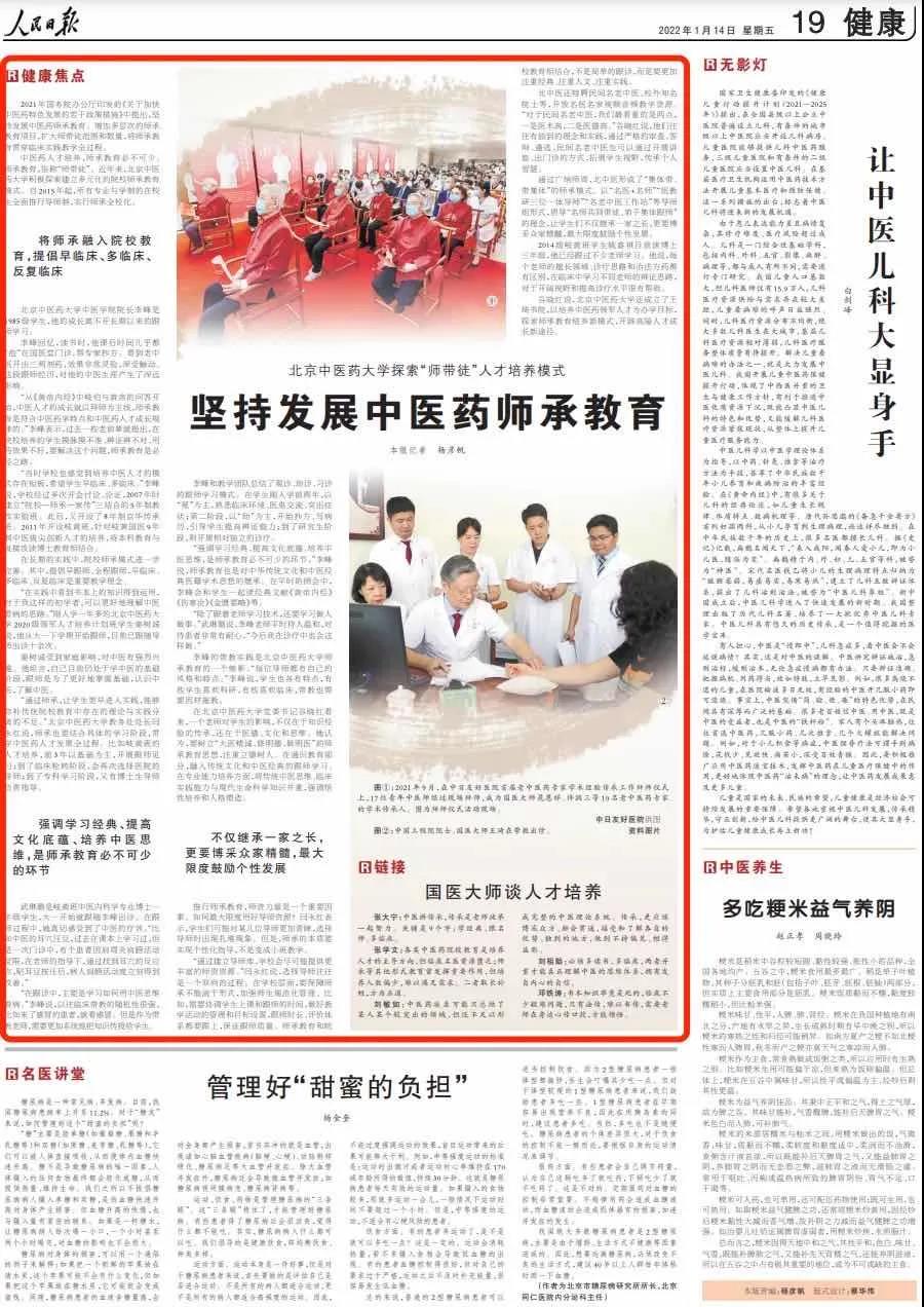1月14日,《人民日報》報道我校探索建立多元化的院校師承教育模式,堅持發展中醫藥師承教育,全文如下: