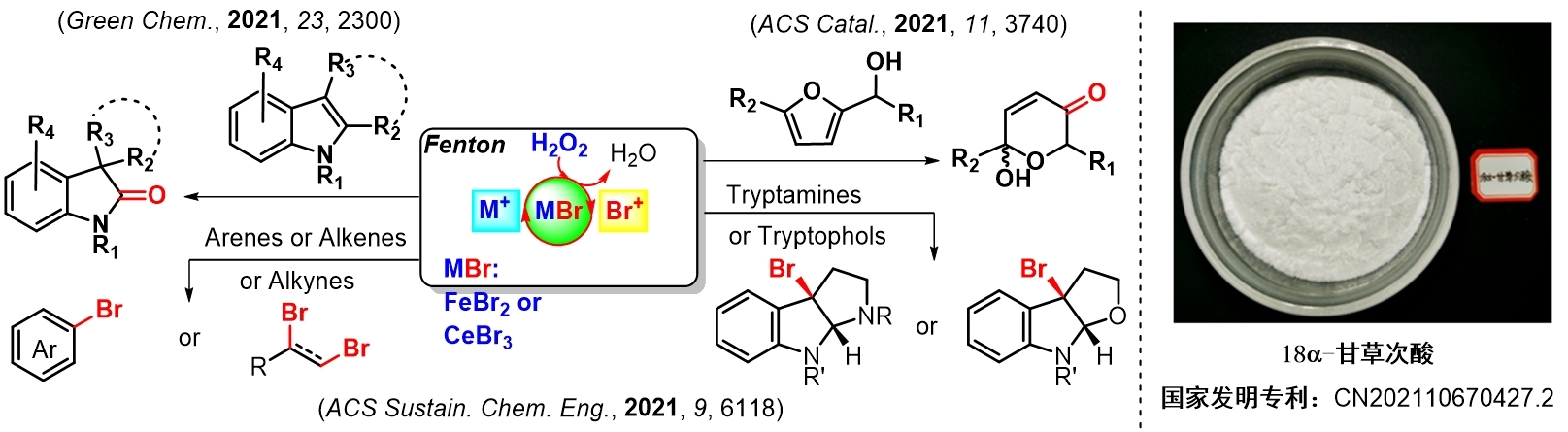芬頓反應(yīng)是一種極為綠色且廉價(jià)的氧化體系,但由于選擇性較差,目前主要局限于污水處理領(lǐng)域。如能提高反應(yīng)選擇性,使其廣泛應(yīng)用于高活性、昂貴、稀缺中藥單體的規(guī)模化制備,必將產(chǎn)生巨大的產(chǎn)業(yè)和學(xué)術(shù)價(jià)值。近期,中藥學(xué)院趙國棟特聘副教授(C類引進(jìn)人才,2021北京市科技新星)聯(lián)合香港科技大學(xué)童榮標(biāo)教授,利用協(xié)同催化策略,使選擇性差的羥基自由基通過“離子-自由基”緊密相互作用優(yōu)先與鹵負(fù)離子反應(yīng),并將原位生成的鹵正離子進(jìn)一步應(yīng)用于氧化、重排和溴代等反應(yīng)(詳見下圖)。相關(guān)成果發(fā)表于美國化學(xué)會主辦期刊:ACS Catalysis(Q1區(qū),IF 13.1),ACS Sustainable Chemistry & Engineering(Q1區(qū),IF 8.2)和英國皇家化學(xué)會主辦期刊:Green Chemistry(Q1區(qū),IF 10.2),趙國棟特聘副教授為第一作者,北京中醫(yī)藥大學(xué)為第一單位。該策略即提高了芬頓化學(xué)的選擇性,也為“精準(zhǔn)中藥”的綠色制備提供了思路( ACS Catal. , 2021, 11 , 3740; Green Chem. , 2021, 23 , 2300; ACS Sustainable Chem. Eng. 2021, 9 , 6118)。