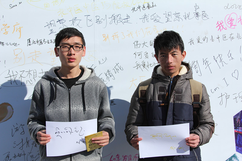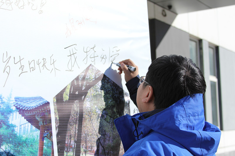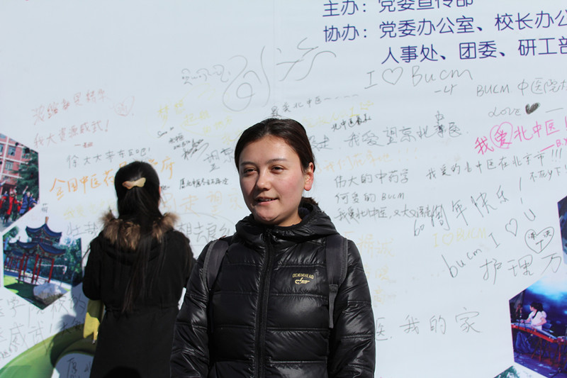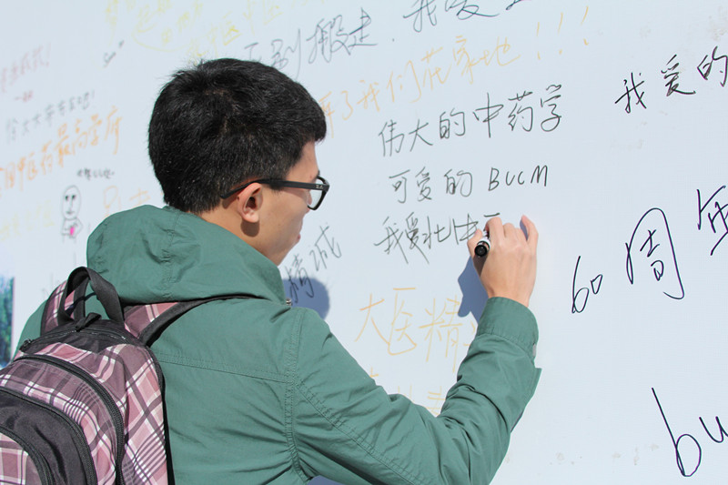 中午下課后,很多同學(xué)經(jīng)過(guò)活動(dòng)現(xiàn)場(chǎng)便饒有興趣地駐足參與,大家言語(yǔ)間互相交流想法,爭(zhēng)先恐后在白紙和背板上寫下心中的北中醫(yī)形象和對(duì)學(xué)校的祝福。幾位少數(shù)民族學(xué)生還特別用本民族的語(yǔ)言和文字抒寫了心中的北中醫(yī)。