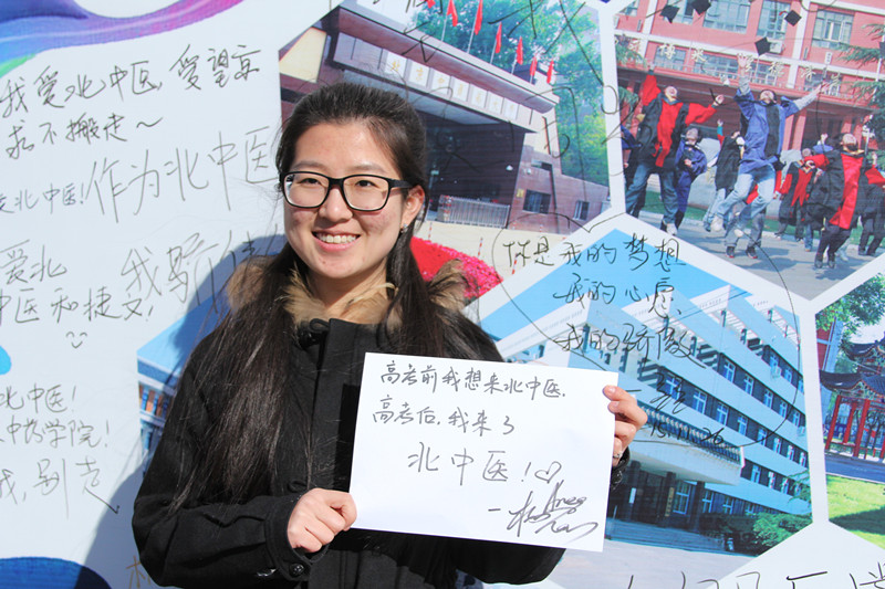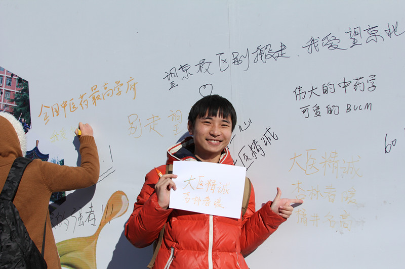 活動(dòng)中,歡聲笑語(yǔ)回響在小小的望京校區(qū),無(wú)限的熱情驅(qū)散了冬日的寒意。大大的背板上寫滿了“大醫(yī)精誠(chéng)”、“博大精深”、“最美北中醫(yī)”、“北中醫(yī)我的家”等深情款款的文字,無(wú)一不流露著同學(xué)們對(duì)學(xué)校的深厚情感。