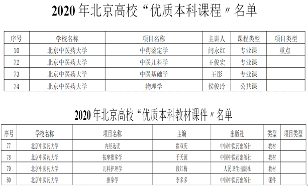近日,北京市教育委員會發布《北京市教育委員會關于公布2020年“優質本科課程”和“優質本科教材課件”遴選結果的通知》(京教函〔2020〕463號),我校《中藥鑒定學》(主講人:閆永紅)、《中醫兒科學》(主講人:王俊宏)、《中醫基礎學》(主講人:王彤)、《物理學》(主講人:侯俊玲)四門課程獲評北京高校“優質本科課程”。其中《中藥鑒定學》(主講人:閆永紅)為重點項目,獲評北京高校“優質本科課程”的主講教師,將同時被認定為“北京高等學校優秀專業課(公共課)主講教師”。