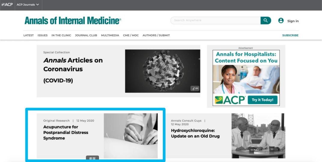 《內(nèi)科學(xué)年鑒》創(chuàng)刊于1927年,是美國內(nèi)科醫(yī)師協(xié)會的官方雜志,主要報道內(nèi)科相關(guān)的臨床與基礎(chǔ)研究結(jié)果、專家評論、醫(yī)師執(zhí)業(yè)準(zhǔn)則、公共衛(wèi)生政策等。美國內(nèi)科醫(yī)師協(xié)會成立于1915年,是世界上最大的醫(yī)療專業(yè)協(xié)會,2018年該雜志影響因子為19.315,被稱為國際內(nèi)科學(xué)領(lǐng)域“第一刊”,中國大陸學(xué)者發(fā)文比例僅占總發(fā)文量的1.09%。該研究歷時三年,通過嚴(yán)謹(jǐn)?shù)捻攲釉O(shè)計和完善的質(zhì)量控制保證研究的真實性,最終發(fā)表在具有國際影響力的頂級期刊上,不僅為中醫(yī)針灸治療餐后不適綜合征的有效性提供了科學(xué)依據(jù),同時也標(biāo)志著我國針灸臨床研究質(zhì)量和水平越來越獲得國際廣泛認(rèn)可,對推動針灸的現(xiàn)代化和國際化具有積極作用,是中醫(yī)針灸走向世界的又一標(biāo)志。