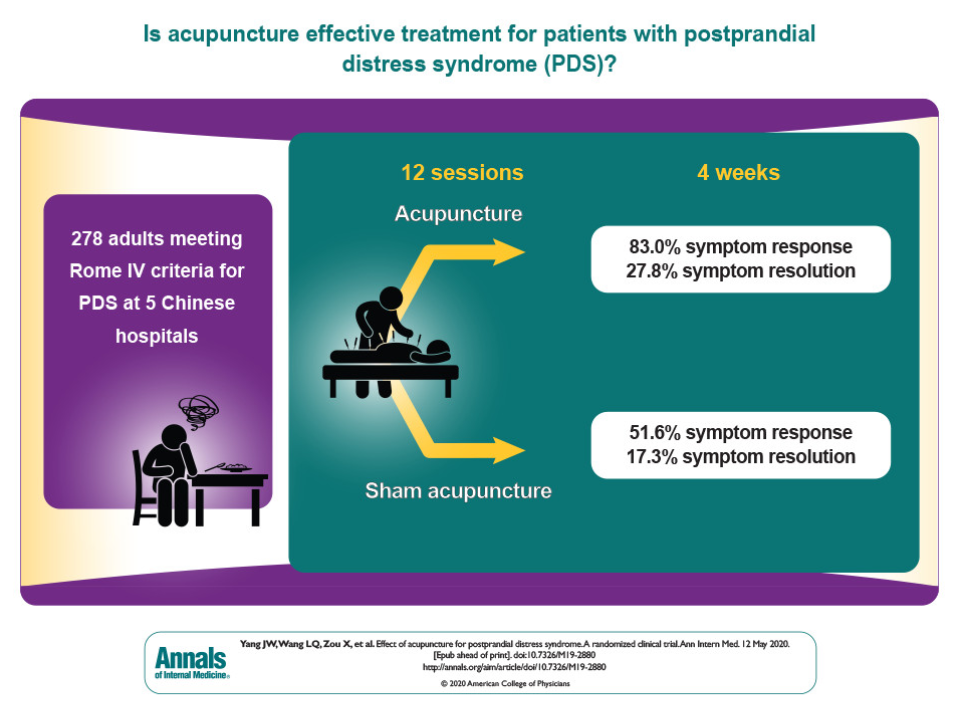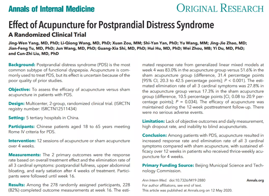 5月12日,國際權(quán)威醫(yī)學(xué)期刊《內(nèi)科學(xué)年鑒》(Annals of Internal Medicine)全文在線發(fā)表了由我校針灸推拿學(xué)院劉存志教授團(tuán)隊牽頭完成的《針刺治療餐后不適綜合征的隨機(jī)對照試驗》文章。我校針灸推拿學(xué)院楊靜雯講師為文章第一作者,劉存志教授為通訊作者。