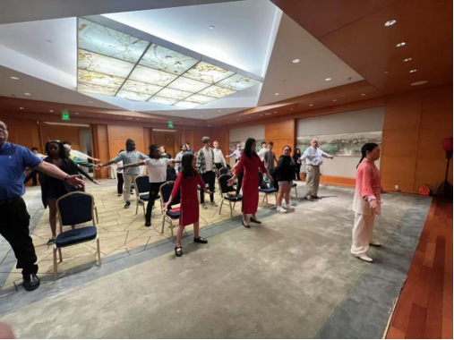 體驗活動結束后,王樂鵬副教授圍繞“順應自然節律,平衡養生之道(Balancing Wellness with the Rhythm of Nature)”主題,詳細闡述了中醫因時制宜的養生智慧。他強調,順應四季變化調整飲食起居,以達到身心和諧的健康境界,并結合現代生活習慣,提供了實用養生建議。張學凱主任以“經穴之韻,身心同調(The Rhythm of Acupoints, Harmonizing the Body and Mind)”為主題,講解了經絡穴位在中醫調理中的核心作用,通過結合實際案例,展示了針灸的神奇療效。胡雁賓副教授通過理論講解與實操教學相結合的方式,展示了中醫養生功法——八段錦的獨特魅力。專家們精彩的講座引發了現場參與者的積極互動和踴躍提問。