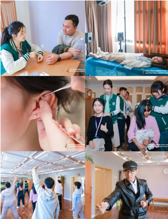 講座結束后,各位嘉賓與青年代表在中醫藥體驗館國針館各診室親身體驗了四診、耳豆、艾灸、針刺、推拿、拔罐、五音、導引等中醫藥特色診療手段及養生功法,與我校中醫國際傳播協會學生骨干成員深入交流。并體驗了中藥五味、了解經絡穴位、學習養生功法、感受中藥炮制過程等。