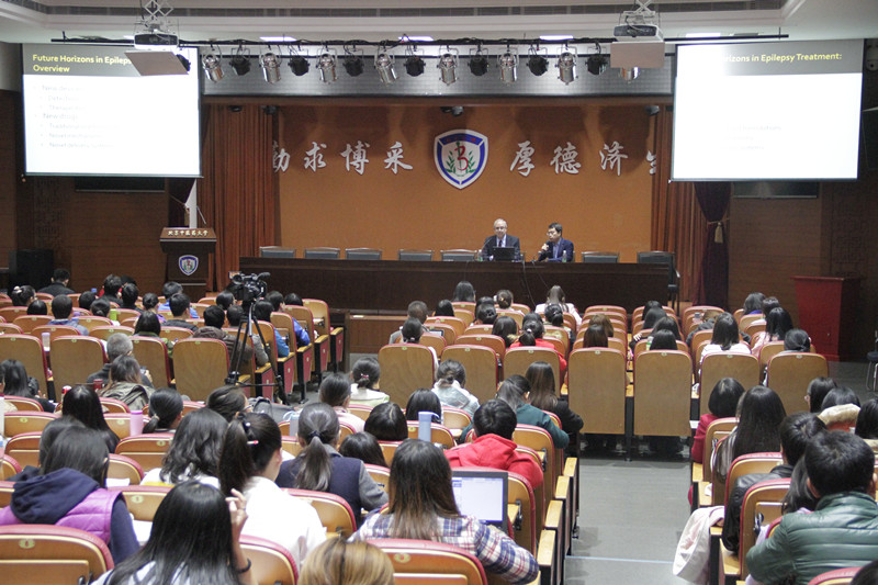 講座中,Sperling教授總結(jié)概括了近年來臨床應(yīng)用有效和正在研發(fā)階段具有良好前景的新技術(shù)和方法,使大家對國際上治療癲癇最前沿的方法有了較為全面的了解。這些新技術(shù)和方法主要包括癲癇預(yù)警系統(tǒng)、新的藥物治療靶點(diǎn)、基因治療、手術(shù)治療、腦部植入等革命性技術(shù)。講授方式是由Sperling教授進(jìn)行英文講解,第三附屬醫(yī)院腦病科主任醫(yī)師曲淼進(jìn)行翻譯。Sperling教授的講座生動、實(shí)用,全場座無虛席,氣氛熱烈,在提問互動環(huán)節(jié),同學(xué)們踴躍提問,并就相關(guān)問題與Sperling教授進(jìn)行了進(jìn)一步的探討和交流。最后,本場海外“名師大講堂”講座在同學(xué)們熱烈的掌聲中圓滿結(jié)束。