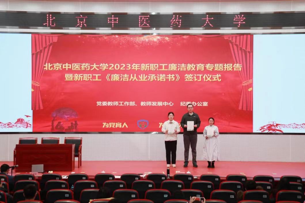 報告結束后,學校2023年新教職工簽訂了《北京中醫藥大學教師廉潔從業承諾書》。承諾書內容涵蓋了教師遵守職業道德規范、保持廉潔自律行為、營造公平公正環境、提升自身師德修養、關注學生成長及需要承擔的責任和義務等方面的具體要求。
