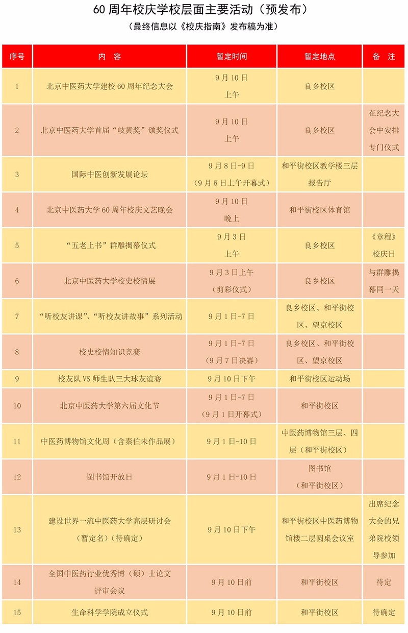 學校60周年校慶的活動設計框架已經基本成型,現在進行預發布,目的是方便大家安排校慶活動期間的行程。這些活動的時間、地點仍然存在變化的可能,最終定案我們將發布《校慶指南》。