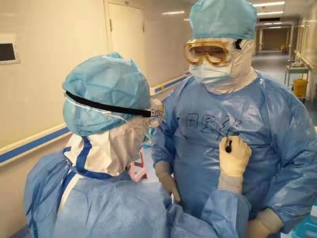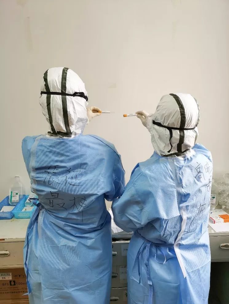 為了戰“疫”,“戰友們”互幫互助檢查隔離戰袍,只為安全上崗每一天。