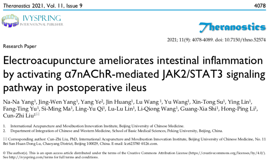 我校專家團隊首次系統(tǒng)揭示了電針改善術(shù)后腸麻痹的炎癥調(diào)控機制近日,國際著名生物醫(yī)學(xué)類期刊 Theranostics (IF=8.579)全文發(fā)表了由我校針灸推拿學(xué)院劉存志教授團隊完成的題為“ Electroacupuncture ameliorates intestinal inflammation by activating α7nAChR-mediated JAK2/STAT3 signaling pathway in postoperative ileus ”的研究論文。102021-03