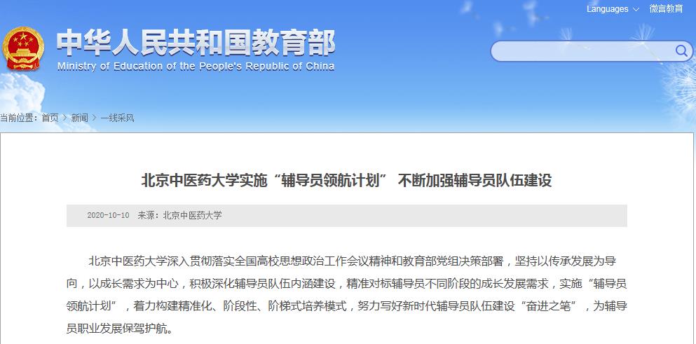 教育部網(wǎng)站報(bào)道我校實(shí)施“輔導(dǎo)員領(lǐng)航計(jì)劃” 不斷加強(qiáng)輔導(dǎo)員隊(duì)伍建設(shè)北京中醫(yī)藥大學(xué)深入貫徹落實(shí)全國高校思想政治工作會(huì)議精神和教育部黨組決策部署,堅(jiān)持以傳承發(fā)展為導(dǎo)向,以成長需求為中心,積極深化輔導(dǎo)員隊(duì)伍內(nèi)涵建設(shè),精準(zhǔn)對標(biāo)輔導(dǎo)員不同階段的成長發(fā)展需求,實(shí)施“輔導(dǎo)員領(lǐng)航計(jì)劃”,著力構(gòu)建精準(zhǔn)化、階段性、階梯式培養(yǎng)模式,努力寫好新時(shí)代輔導(dǎo)員隊(duì)伍建設(shè)“奮進(jìn)之筆”,為輔導(dǎo)員職業(yè)發(fā)展保駕護(hù)航。022020-11