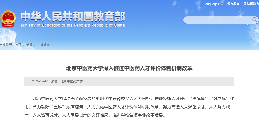 教育部網(wǎng)站報(bào)道我校深入推進(jìn)中醫(yī)藥人才評價(jià)體制機(jī)制改革北京中醫(yī)藥大學(xué)以培養(yǎng)全面發(fā)展的新時(shí)代中醫(yī)藥拔尖人才為目標(biāo),著眼發(fā)揮人才評價(jià)“指揮棒”“風(fēng)向標(biāo)”作用,著力破除“五唯”頑瘴痼疾,大力實(shí)施中醫(yī)藥人才評價(jià)體制機(jī)制改革,努力營造人人渴望成才、人人努力成才、人人皆可成才、人人盡展其才的良好格局,推進(jìn)學(xué)校各項(xiàng)事業(yè)改革發(fā)展。102020-12