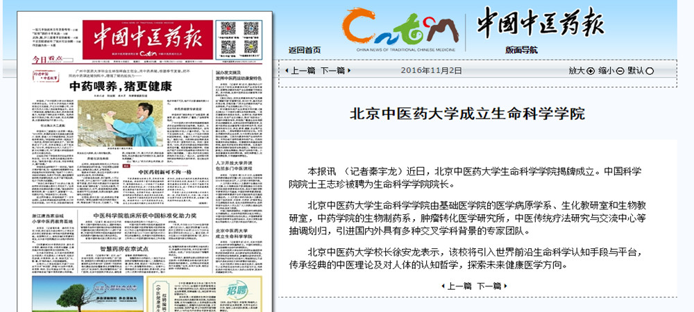 《人民日報》、《中國中醫(yī)藥報》、《健康報》、光明網(wǎng)、中國教育網(wǎng)絡(luò)電視臺等社會媒體報道我校舉行生命科學(xué)學(xué)院成立及揭牌儀式北京中醫(yī)藥大學(xué)日前在京舉行生命科學(xué)學(xué)院成立及揭牌儀式。中國科學(xué)院院士王志珍擔(dān)任院長。北京中醫(yī)藥大學(xué)校長徐安龍說,生命科學(xué)學(xué)院的成立,不僅是一個嶄新機構(gòu)的建立,更是一個嶄新學(xué)科的開始,我們要引入世界最前沿的生命科學(xué)認知手段與平臺,傳承經(jīng)典的中醫(yī)理論及對人體的認知哲學(xué)。042016-11