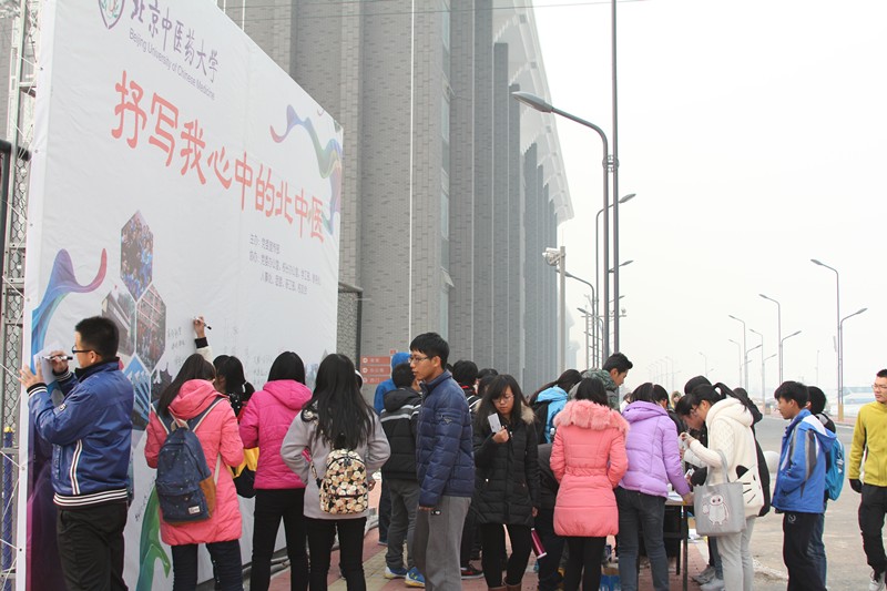 “抒寫我心中的北中醫”活動走進望京校區11月26日中午,“抒寫我心中的北中醫”活動走進望京校區。中午下課后,很多同學經過活動現場便饒有興趣地駐足參與,大家言語間互相交流想法,爭先恐后在白紙和背板上寫下心中的北中醫形象和對學校的祝福。幾位少數民族學生還特別用本民族的語言和文字抒寫了心中的北中醫。262015-11